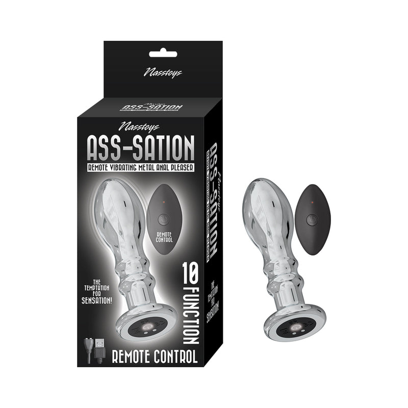 Ass-Sation brings together metal and vibration for orgasmic results. For lovers of metal sex toys you can now take part in a vibration in your favorite material sensation. Explore 10 different vibrating functions using the controls on the toy or the handy remote control. Try immersing the Ass-Sation Remote Control Vibrating Metal Butt Plug in warm or cool water beforehand for fun sensation play. The Pleaser Plug comes in a sleek design that features a rounded tip and prostate-pleasing bulb. The bulb is ergonomically shaped to hit the nerve-ending packed prostate perfectly once fully inserted. The Pleaser Plug is sized for intermediate level manageability - precision tapering gradual widening and a nice slim neck combine to make it easy to insert simple to maneuver and comfortable for longer term wear thanks to a nice flat base and remote control. Use with any of your favorite lubricants. After use carefully wash the toy with mild soap and water or Toy Cleaner for even quicker cleanup.