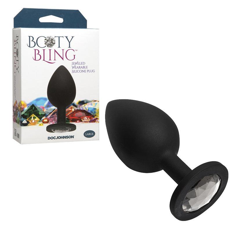Add some beauty to your booty. Color sparkles brightly and contrasts with the black silicone to visually stimulate your partner and Booty Bling’s flared base ensures safe play. The tapered tip thin stem and classic spade shape of the pliable health-grade silicone plug makes Booty Bling feel as good as it looks. Measures 3.8 in. long 3.4 in. insertable by 1.5 in. diameter.
