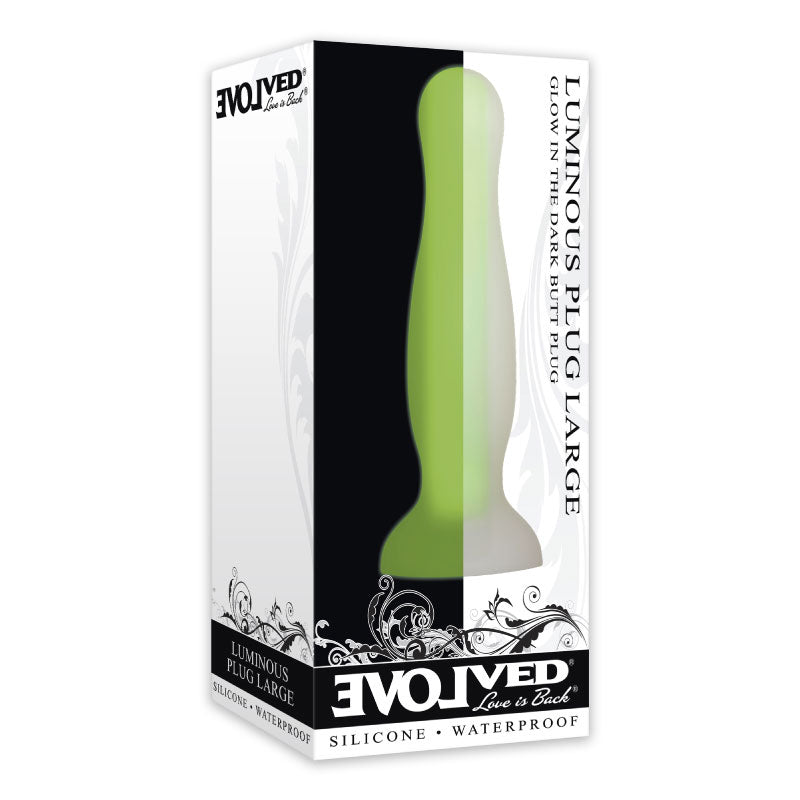 Glow in the dark while you experience a mind-blowing orgasm! This large butt plug glows a groovy green at its inner core with a dual layered silicone shaft that feels squishy and soft and has flexibility to move with your body. Advanced anal players will love the size and bowling pin shape that tantalizes upon entry and then keeps giving until you say stop! Accidents will never happen with the generous flared base and its powerful suction cup gives you a hands-freeplay option! Clean with Evolved Toy Cleaner and a hot water rinse. Waterproof! Powerful suction cup base for hands-free play. @np2020-05 @summer2020-10 @summer2020-19