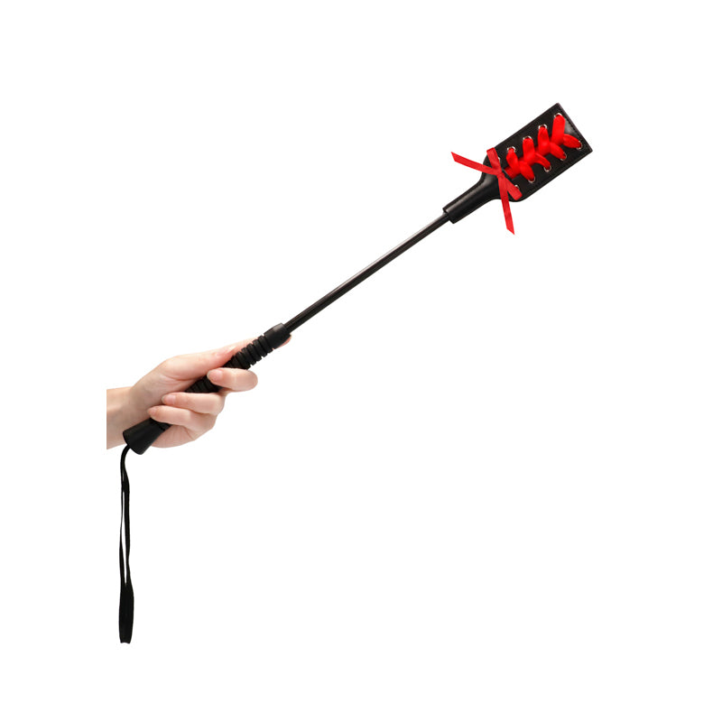 "Ouch! Crop Black Rectangle With Red Lace - Large. This short handled rectangular shaped crop with black lace is the perfect way to discipline your partner."