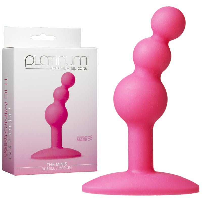 Made of Platinum Premium Silicone this cute little anal plug features three graduated bead-like ripples for increased stimulation a velvety matte finish ergonomic flat base and ultra-flexible design for easy wearability. The perfect size for beginners the Bubble Mini in size Medium offers 3.4 in. of usable length with 1.1 in. diameter. Hypoallergenic and Phthalate-free.